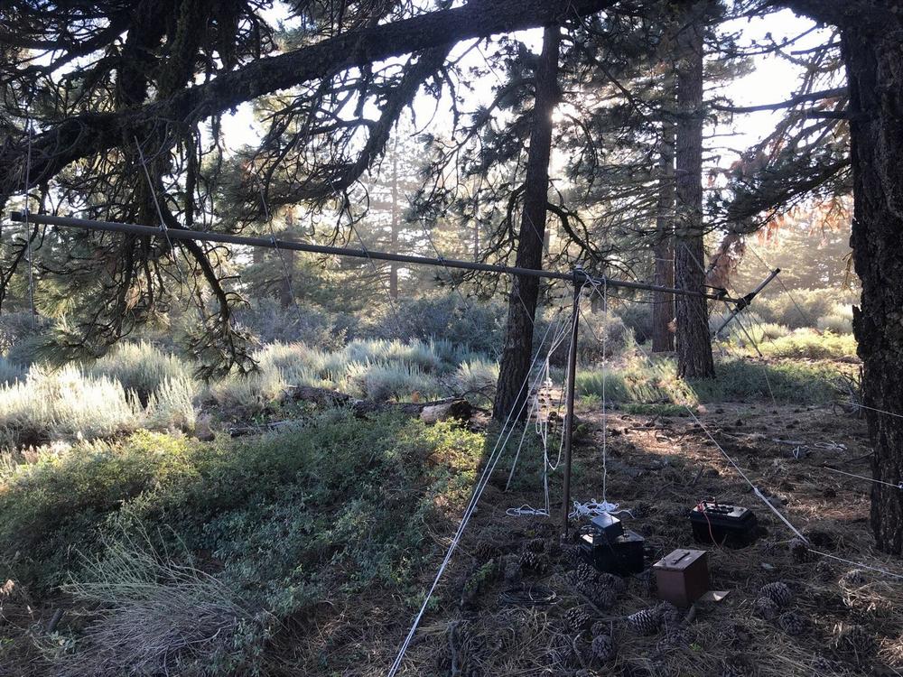 stacked J pole propped up to a tree. T9 was hidden a short